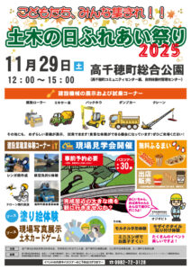 「土木の日ふれあい祭り2025」に協賛出展しました。 2025/12/02 イベント 公開情報 新着情報 11月29日(土)に、高千穂町コミュニティセンター裏、自然休養村管理センターで開催された 「土木の日ふれあい祭り2025」に協賛出展しました。天候にも恵まれ、多くの来場者で大盛況でした。 新着記事一覧に戻る